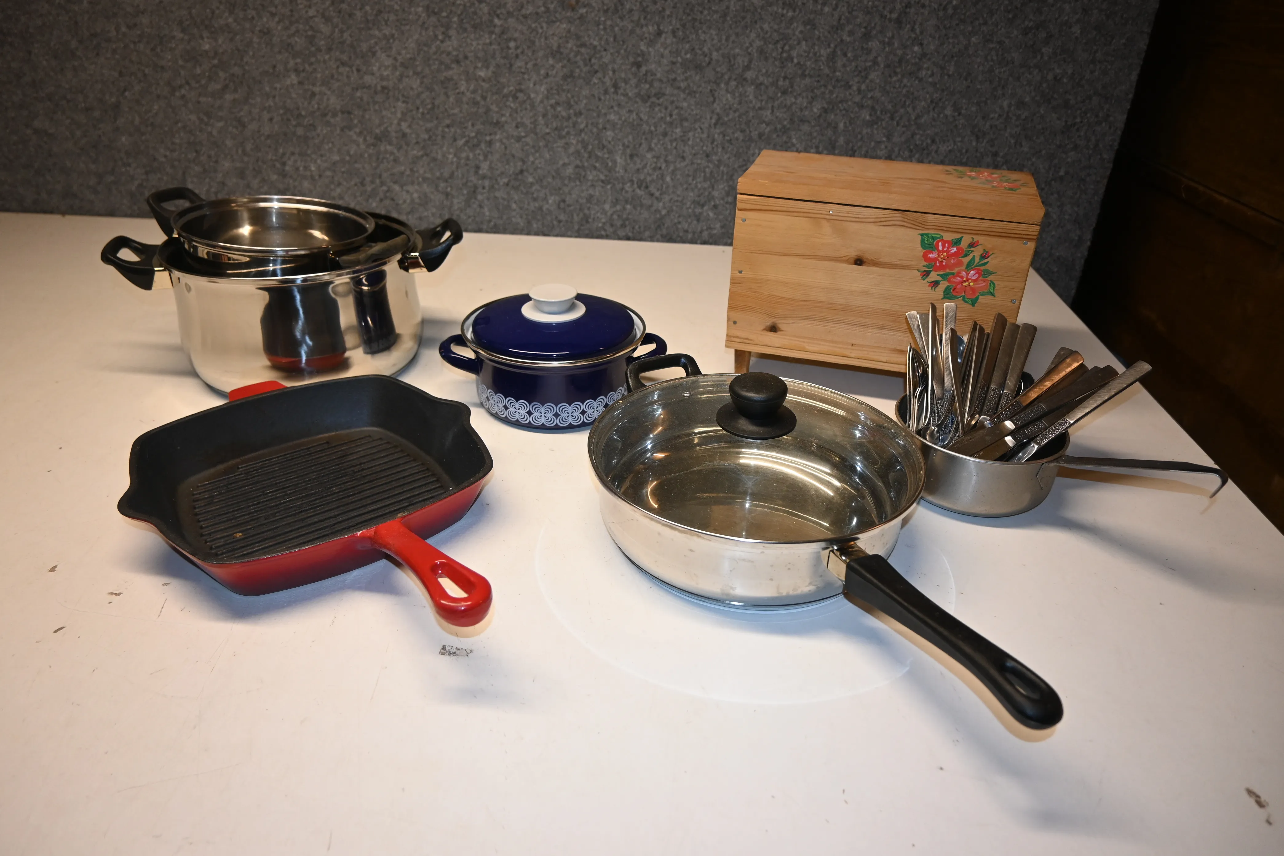 Parti syskrin, grytor, bestick i rostfritt, grillpanna i gjutjärn