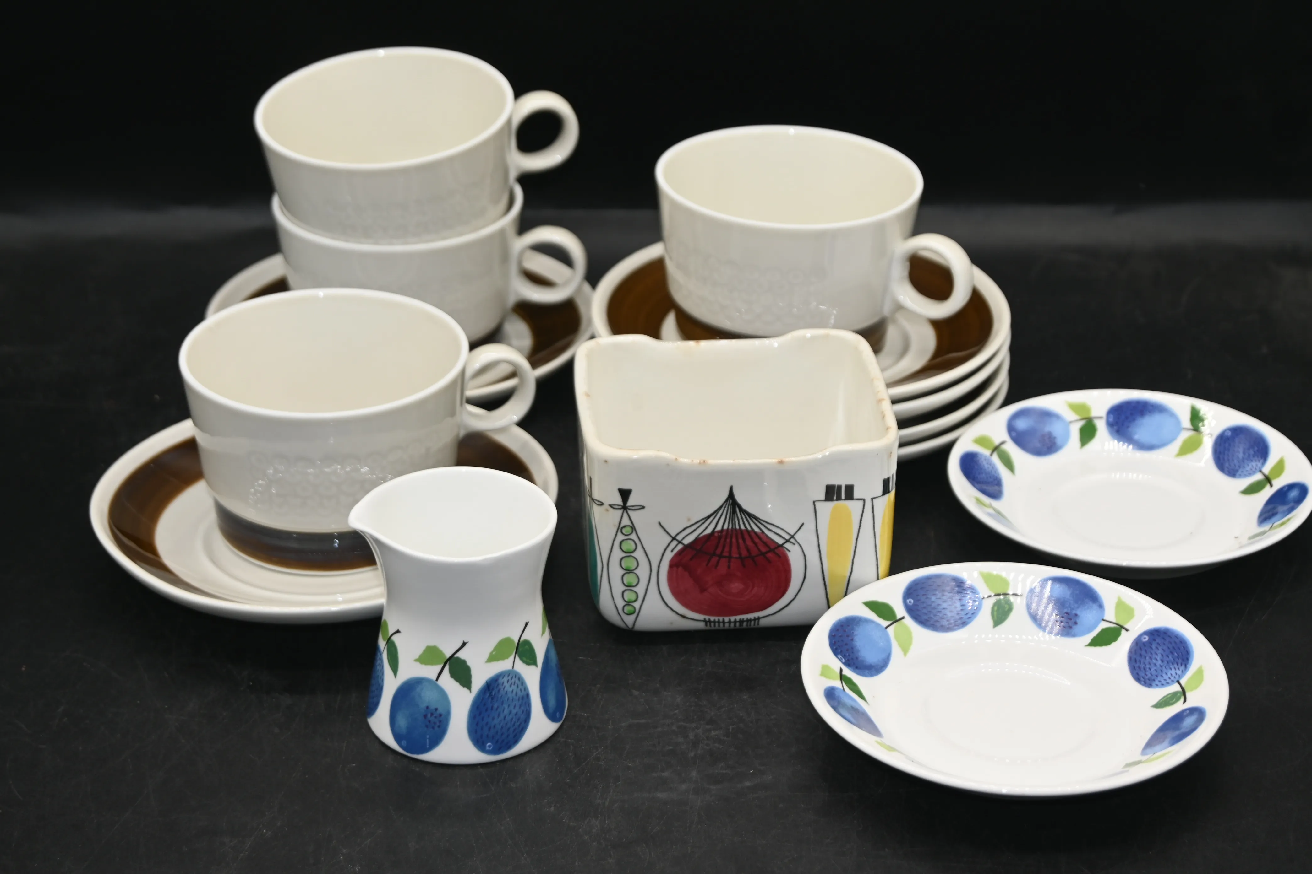 Parti tekoppar Rörstrand "Forma", smörbytta "Picknick", 3del Gustavsberg "Prunus" (ngt nagg kan förekomma)