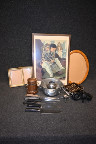 146. Parti tennskål B8, tavla tryck, spegel, kaffeskedar, fotoramar, hörlurar m.m