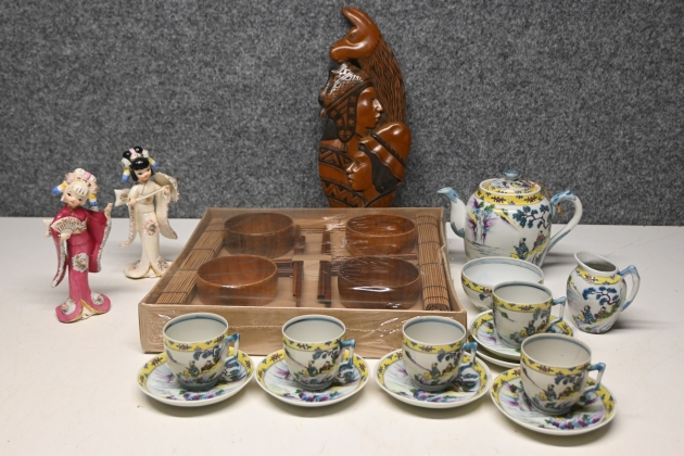 69. Parti teservis Asien (spricka i en kopp), figuriner Geisha 1900.talets andra hälft, matset Japan, väggrelief