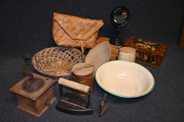 Parti träföremål, emaljerad bunke, kaffekvarn, strykjärn m.m