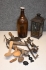 178. Parti träkåsor, svagdryckeskrus, äldre skridskor, ljuslykta (skadat glas)