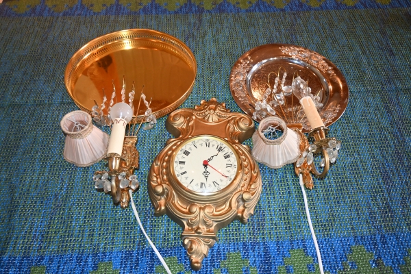 516. Parti nickelservis, rosa ljung, figurin i konstglas, tillbringare "England" m.m