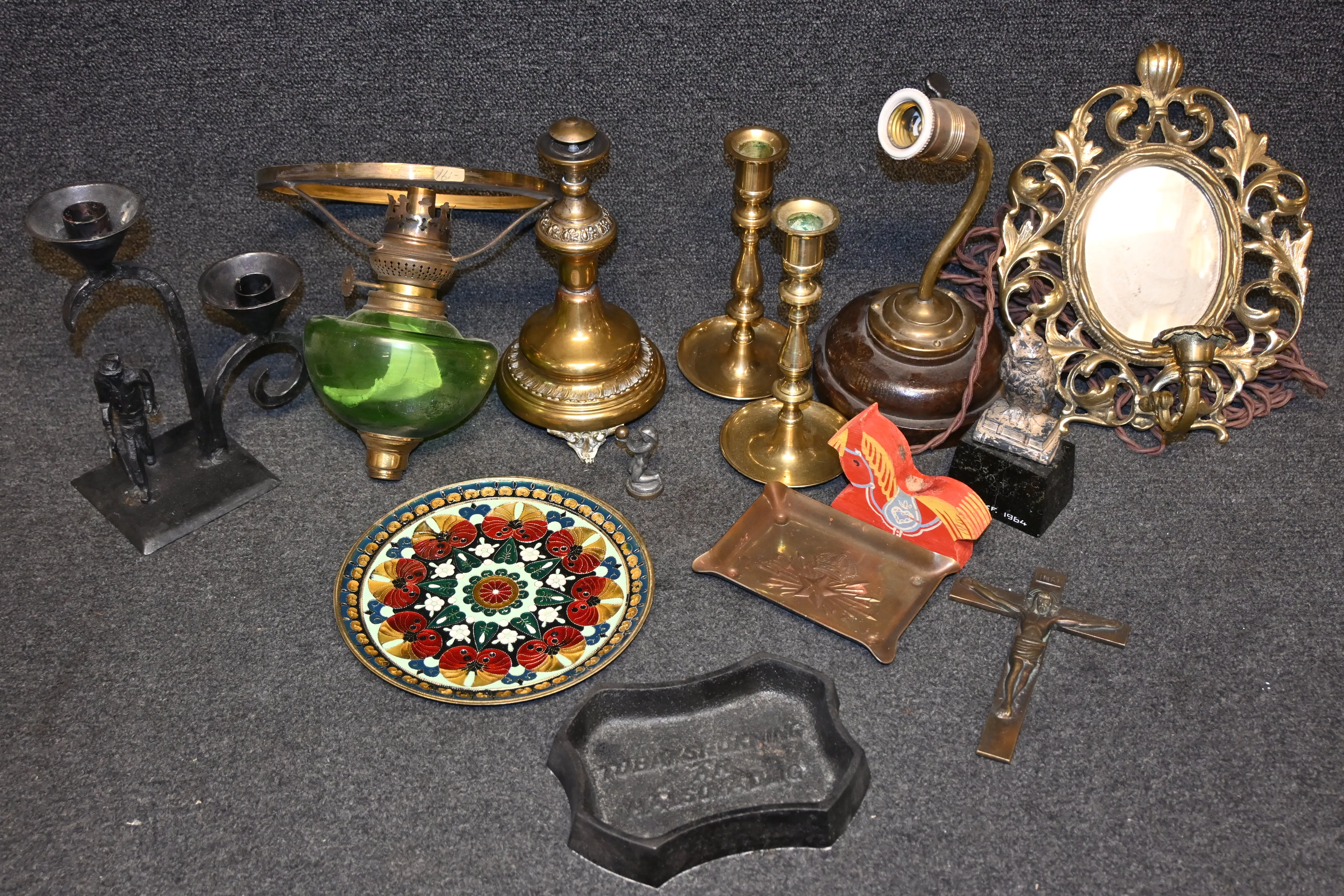Parti vägglampa, ljusstakar i mässing, oljehus m.m