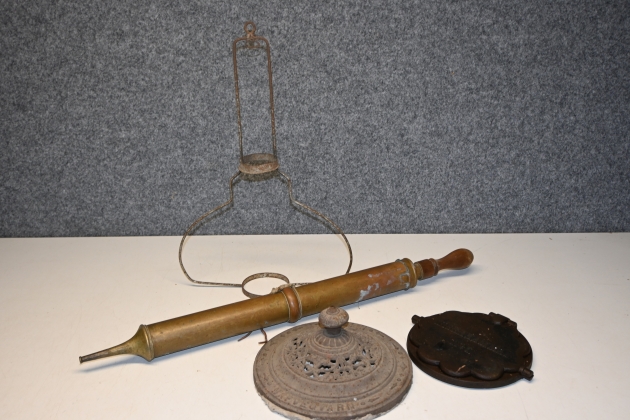 442. Parti våffeljärn, brandspruta, topp till kamin "Näfverqvarn", torparlampa (skärm & oljehus saknas)