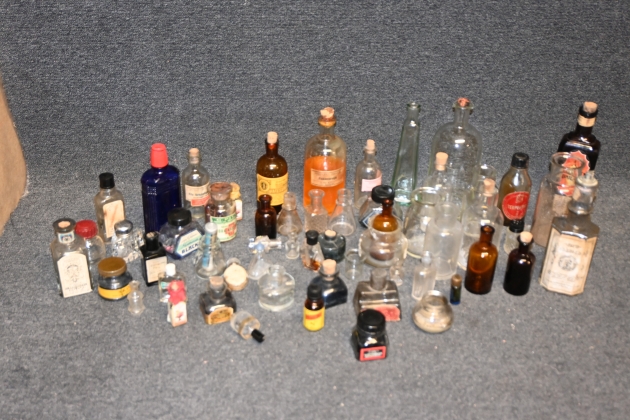 312. Parti äldre medcinflaskor, bläckhorn, parfym