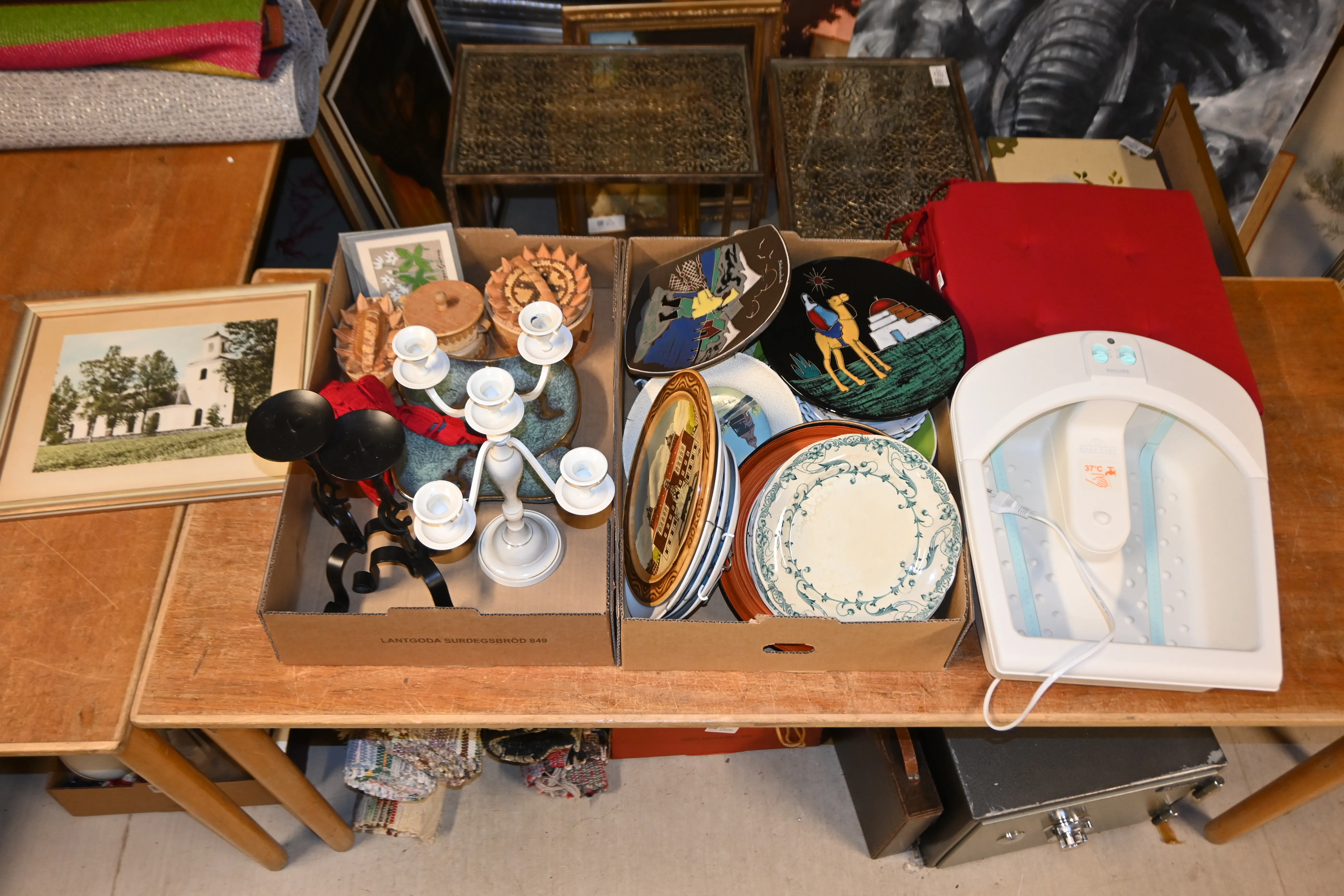 518. Partilådor 2st porslin, ljusstakar, näverföremål, fotbad, 4st dynor (oanvända)