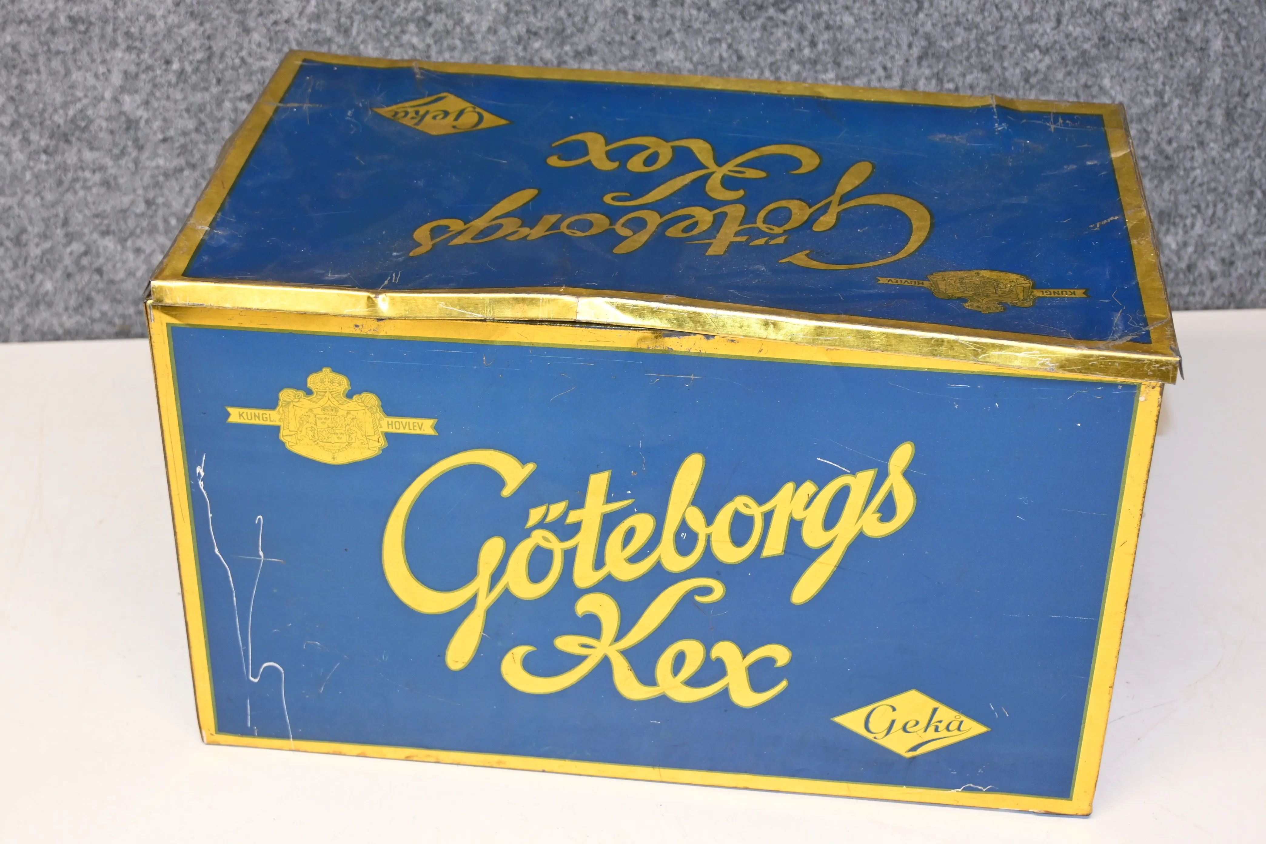 Plåtburk, Göteborgs Kex "Gekå" H:26cm L.45cm (locket buckligt)