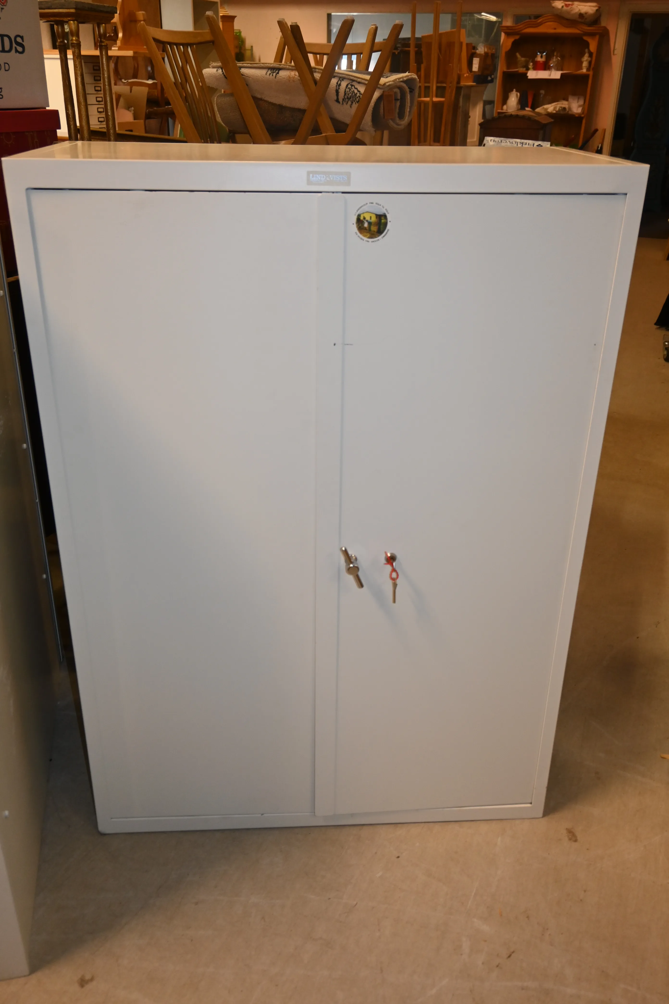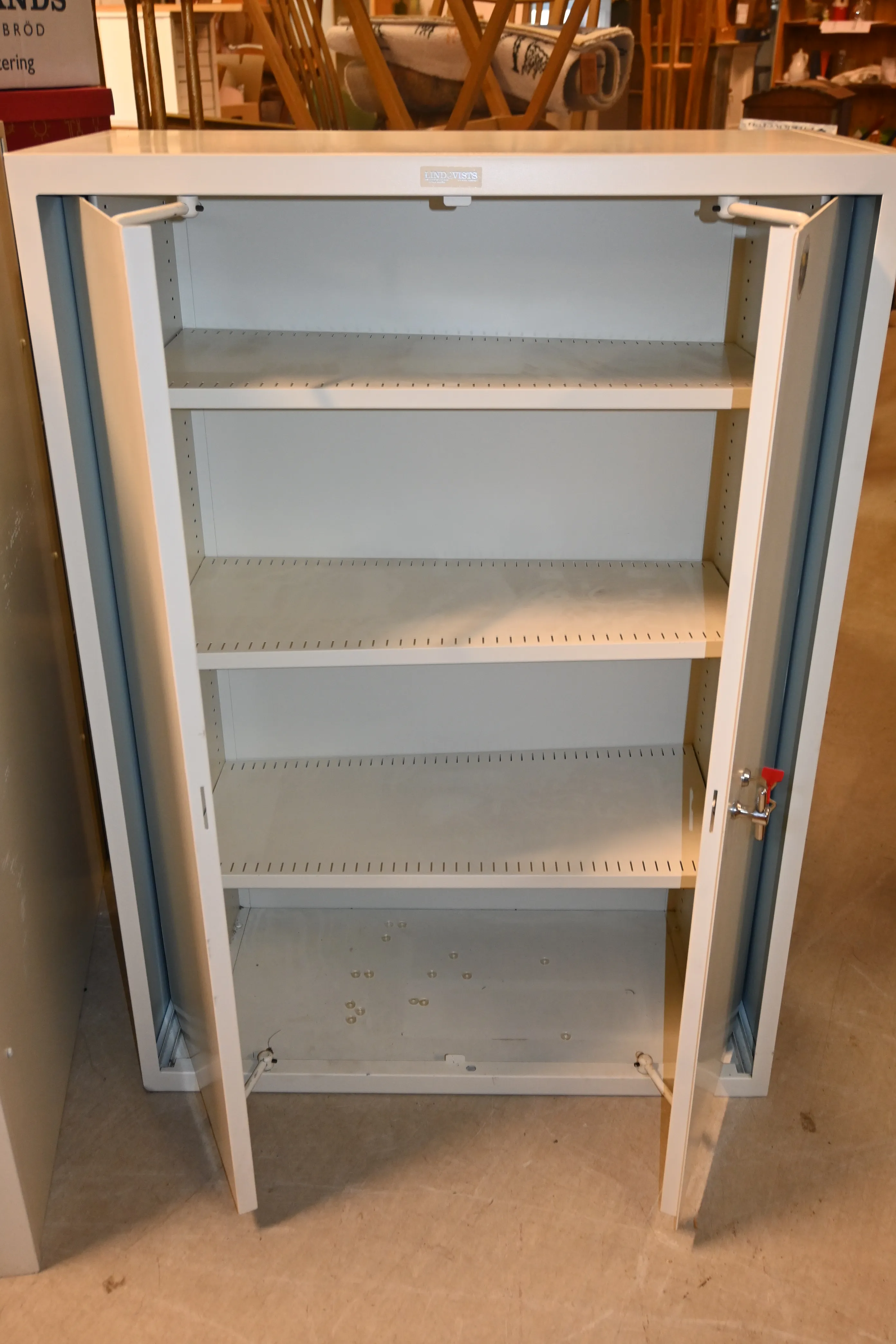 569. Plåtskåp med hyllor , låsbara , nycklar finns , Lindqvist Verkstads AB , Motala H.131,5cm B.94cm Djup 43cm