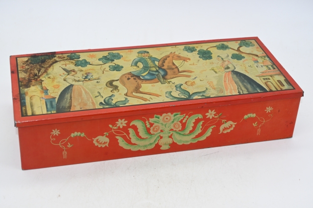 659. Plåtburk Anders Mattsson Mora i fint skick L35cm