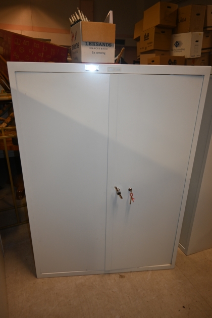 571. Plåtskåp med hyllor , låsbara , nycklar finns , Lindqvist Verkstads AB , Motala H.131,5cm B.94cm Djup 43cm