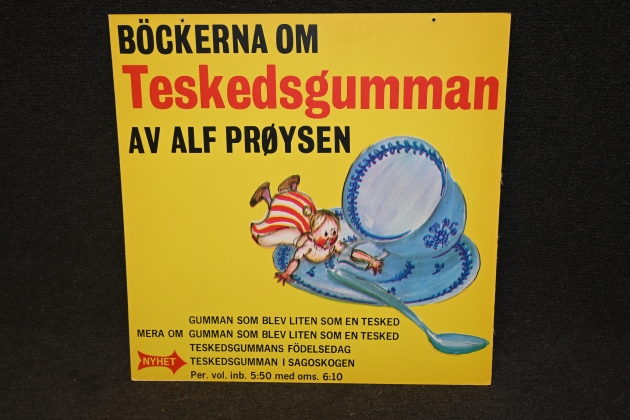 6. Reklamskylt i papp dubbelsidig "Böckerna om Teskedsgumman" 49x51cm
