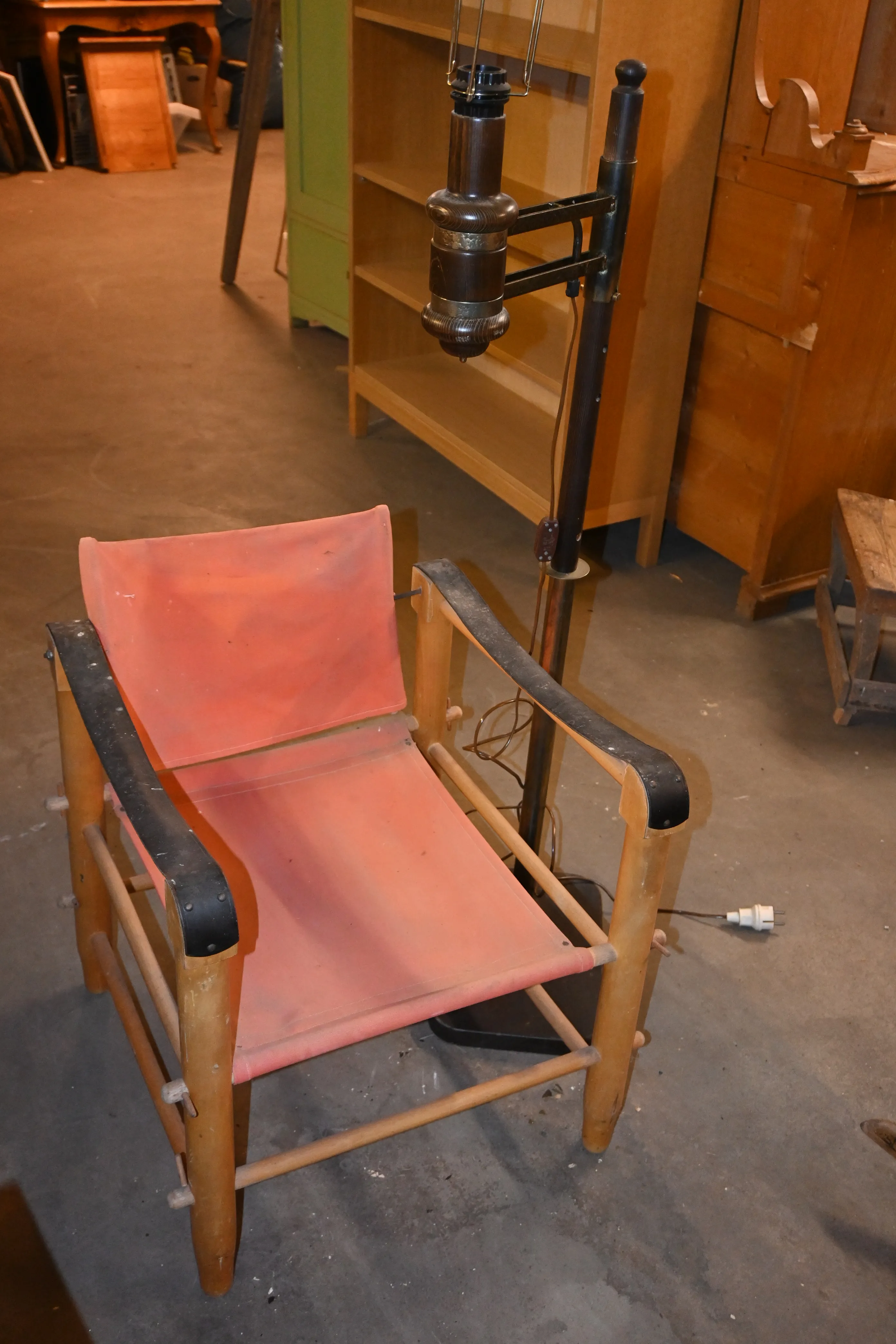 112. Safaristol (Slitage) + golvlampa 1970/80.tal (skärm saknas)