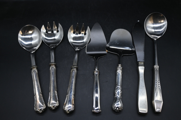 151. Salladsbestick, osthyvel, tårtspade, med silver i skaften 7del total vikt 637gr