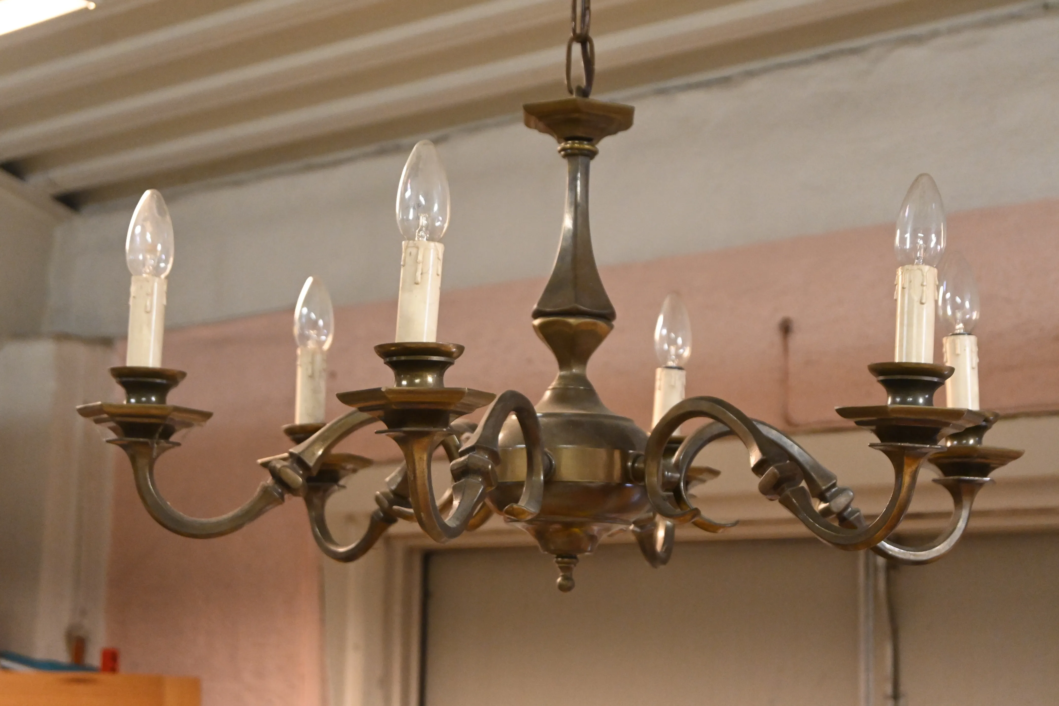 483. Sexarmad taklampa malm höjd med kätting 70 cm D:75 cm