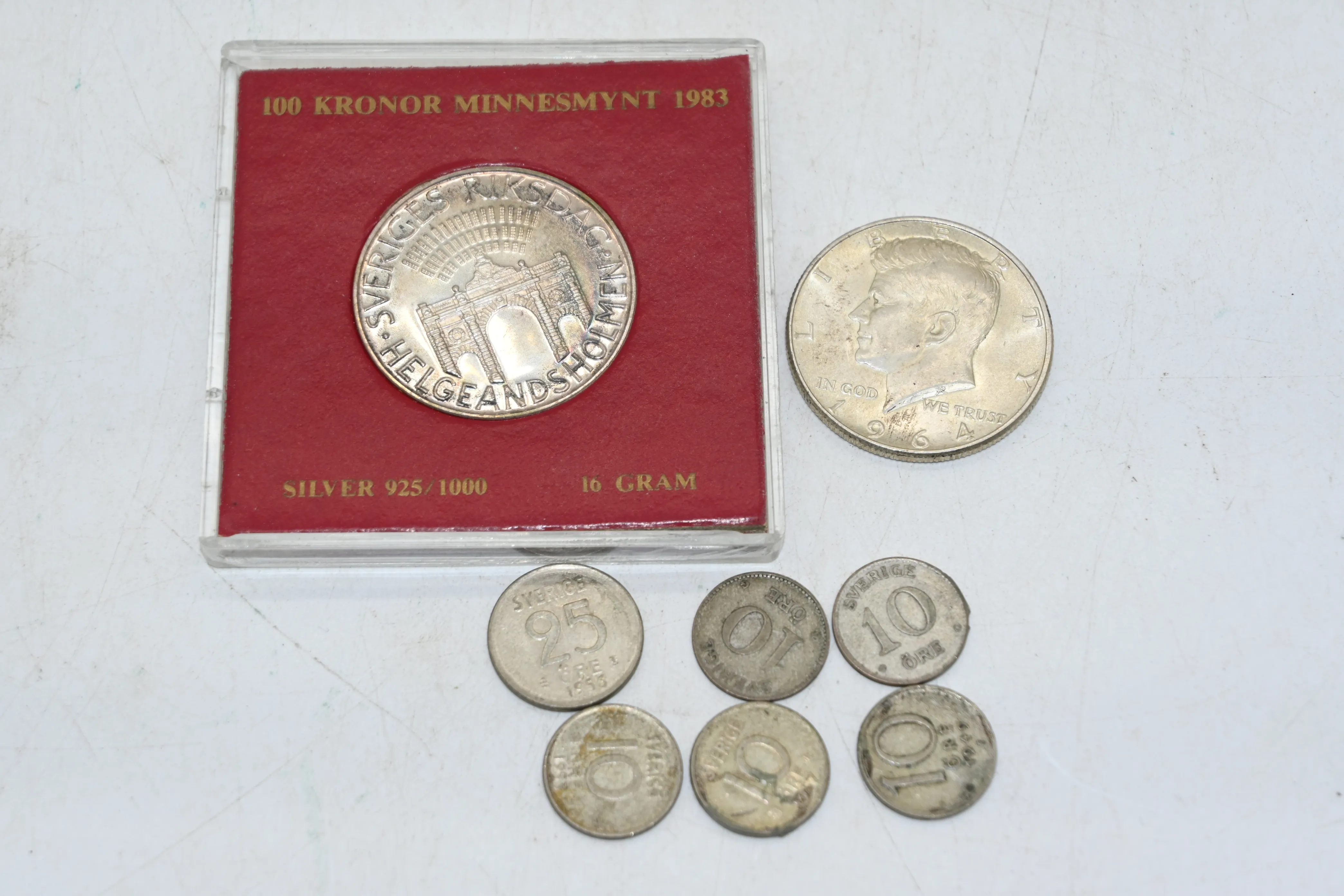 505. Silvermynt, 100 kronor minnesmynt, 25öring, 10öringr, halv dollar 1964 tot vikt 38.10gr