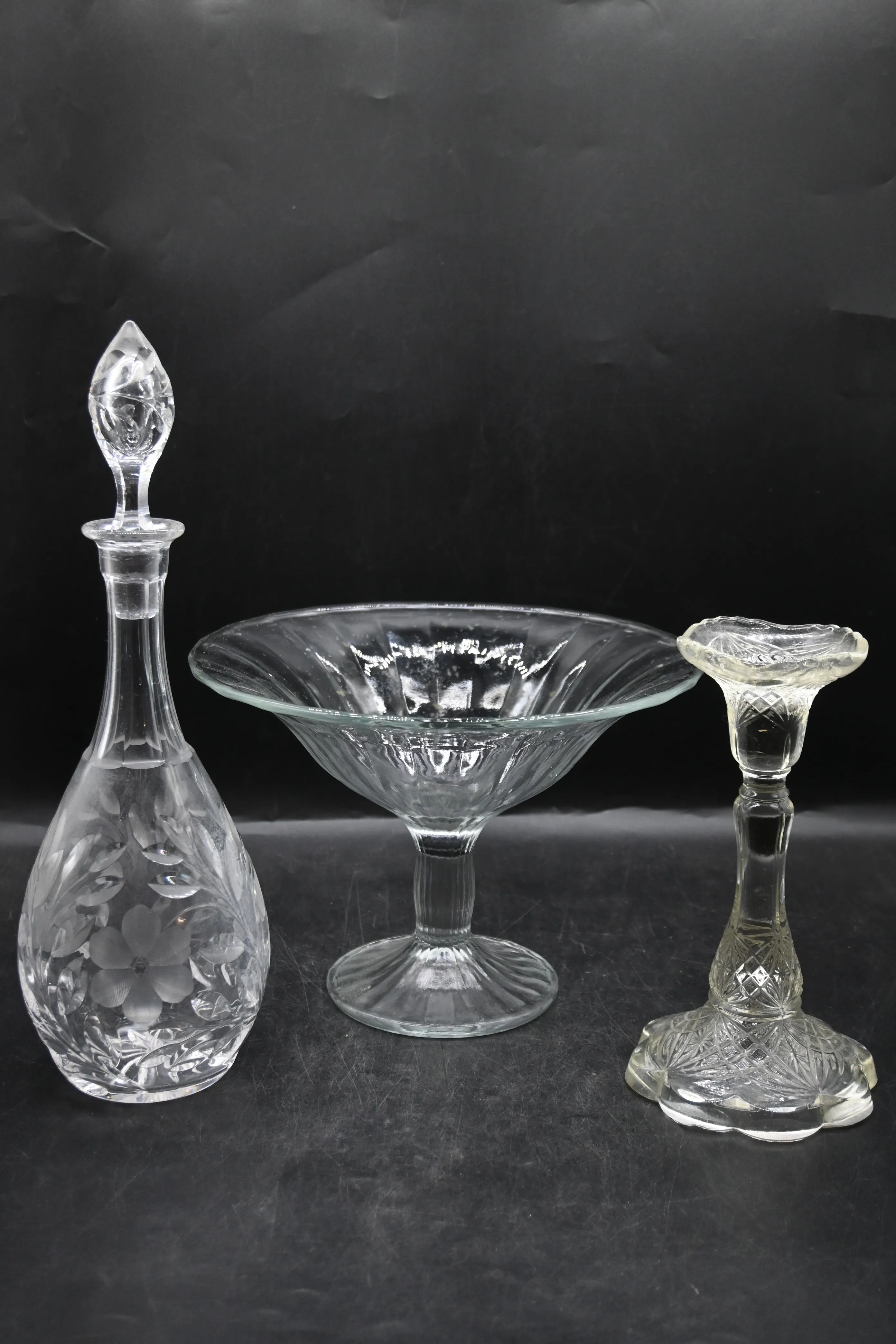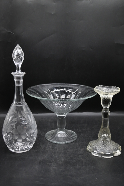 Skål på fot, karaff med slipning, ljusstake i pressglas
