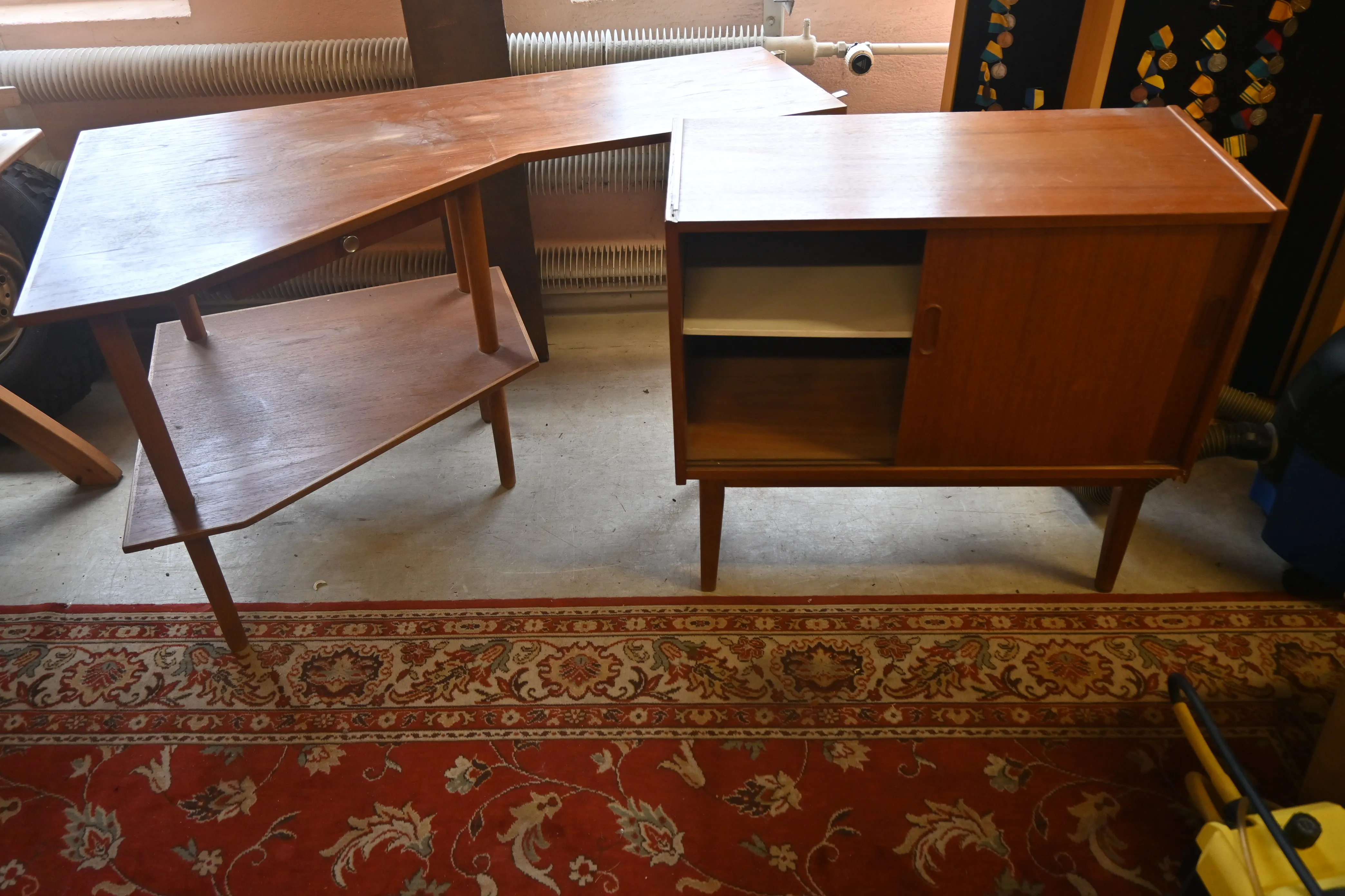 Skåp L.79cm Dj.37,5cm H.71cm +hylldel L.125cm Dj.65cm H.70cm i teak (slitage)