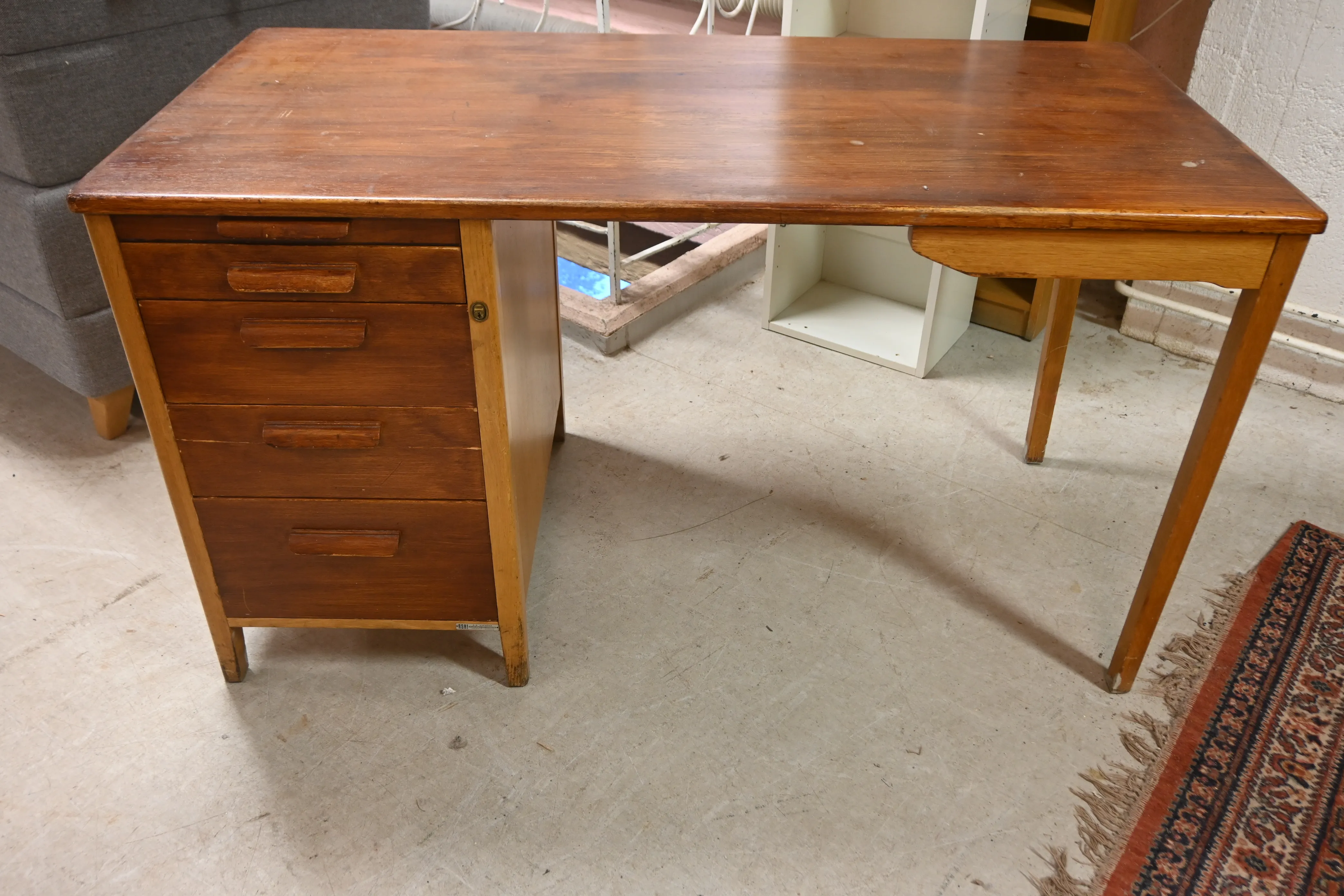 Skrivbord 1900.talets mitt L.140cm B.70cm H.77cm (bruksslitage, märken, nyckel saknas)