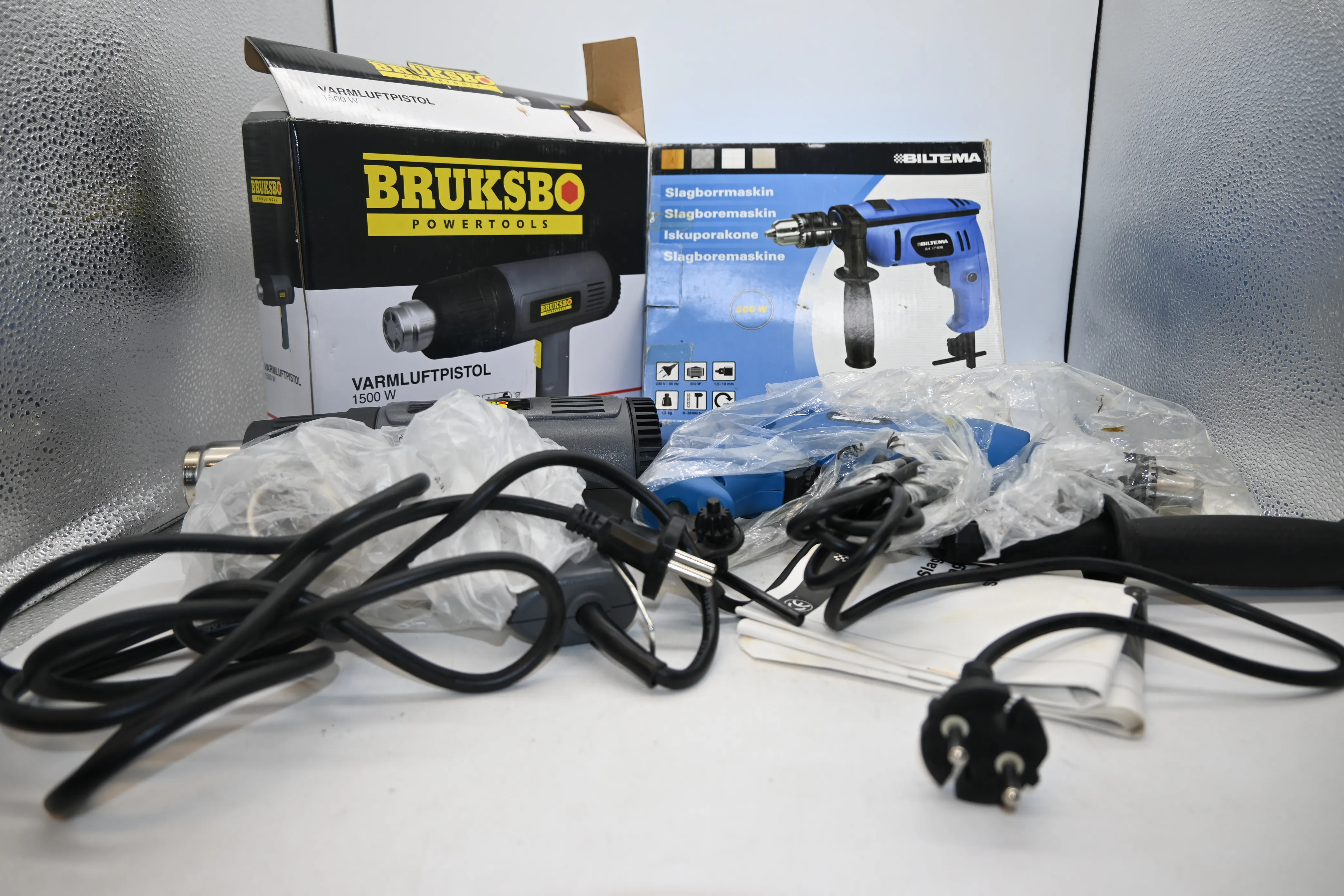 555. Slagborrmaskin Biltema+Varmluftspistol Bruksbo , Oanvända, nya i kartong