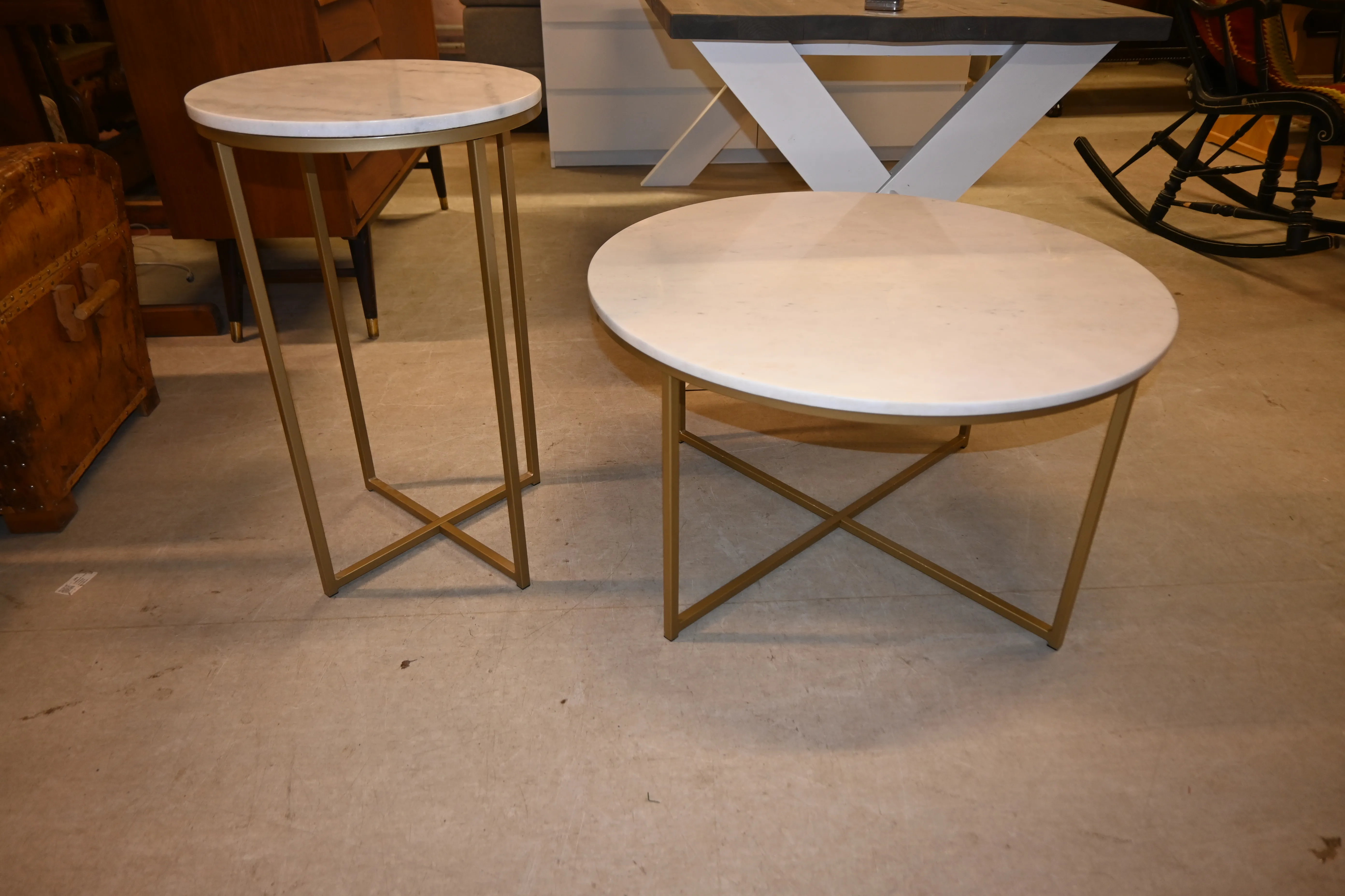 Soffbord H.46cm D.80cm + lampbord H.71cm D.43cm i metall med marmorskivor