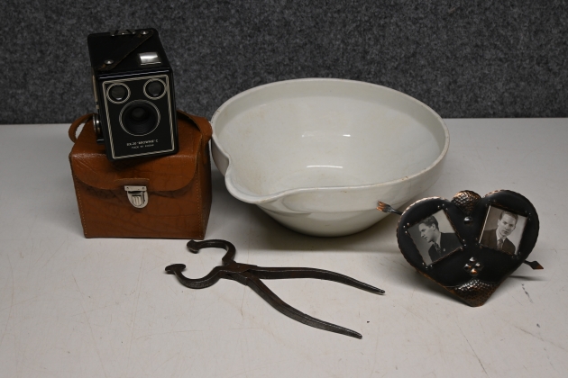 Spilkum, sockertång, lådkamera Six-20 "Brownie" C, fotoram