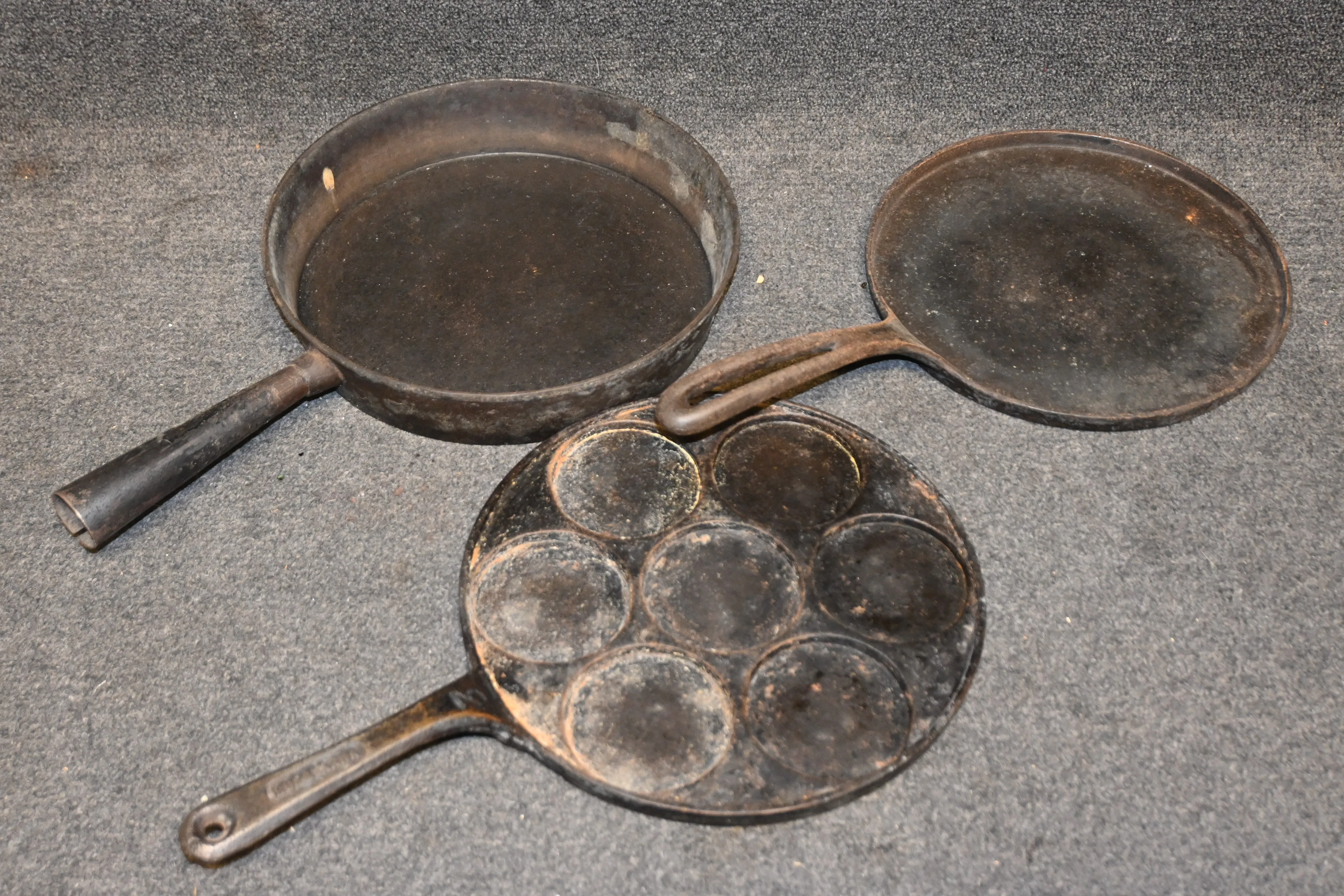 299. Stekpanna & plättlagg "Husqvarna", pannkakspanna "Kockuns No.1" i gjutjärn D.26cm
