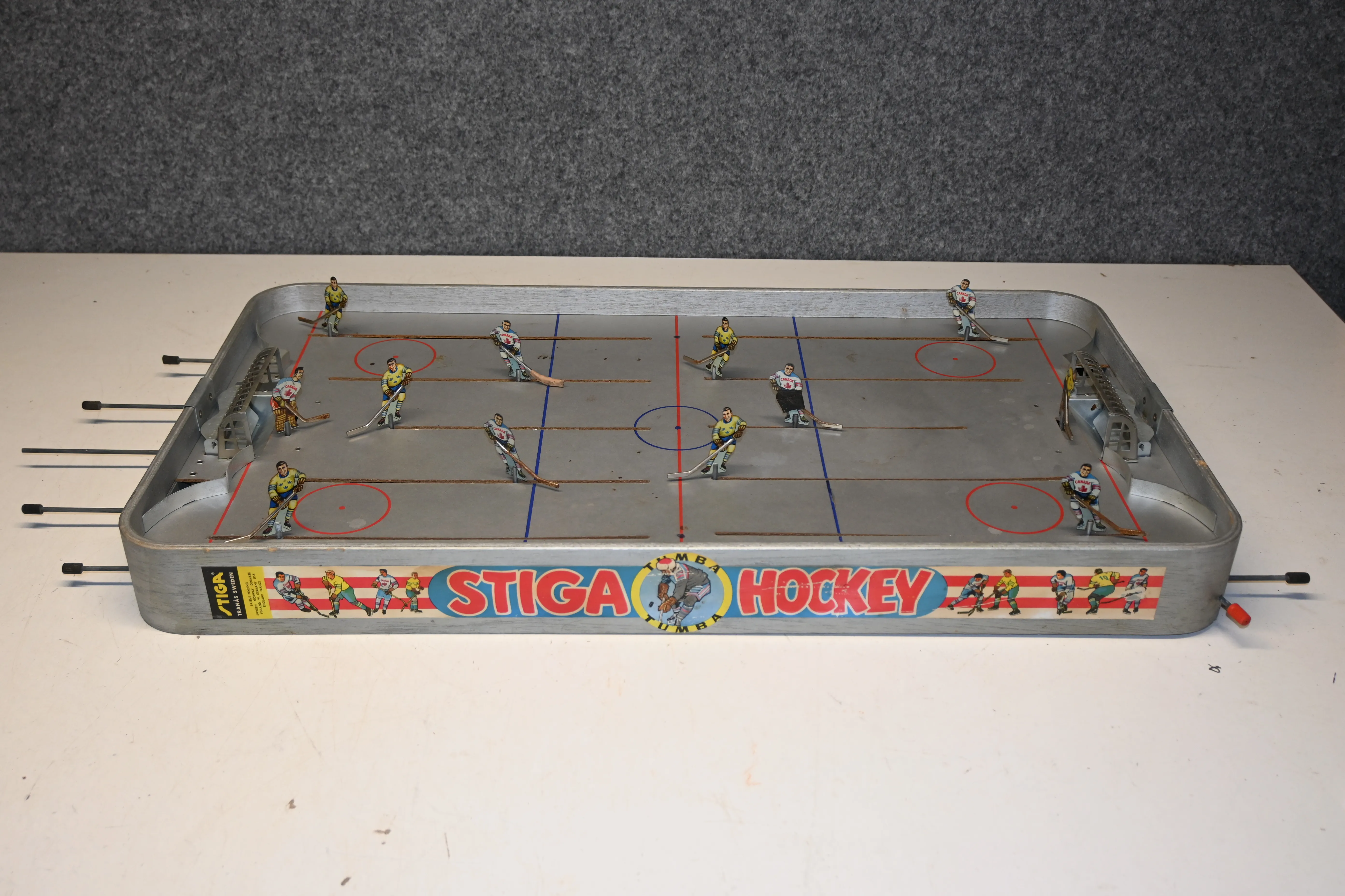 Stiga Tumba Hockeyspel 1900.talets mitt (puck saknas, 2st spelare m lagning)