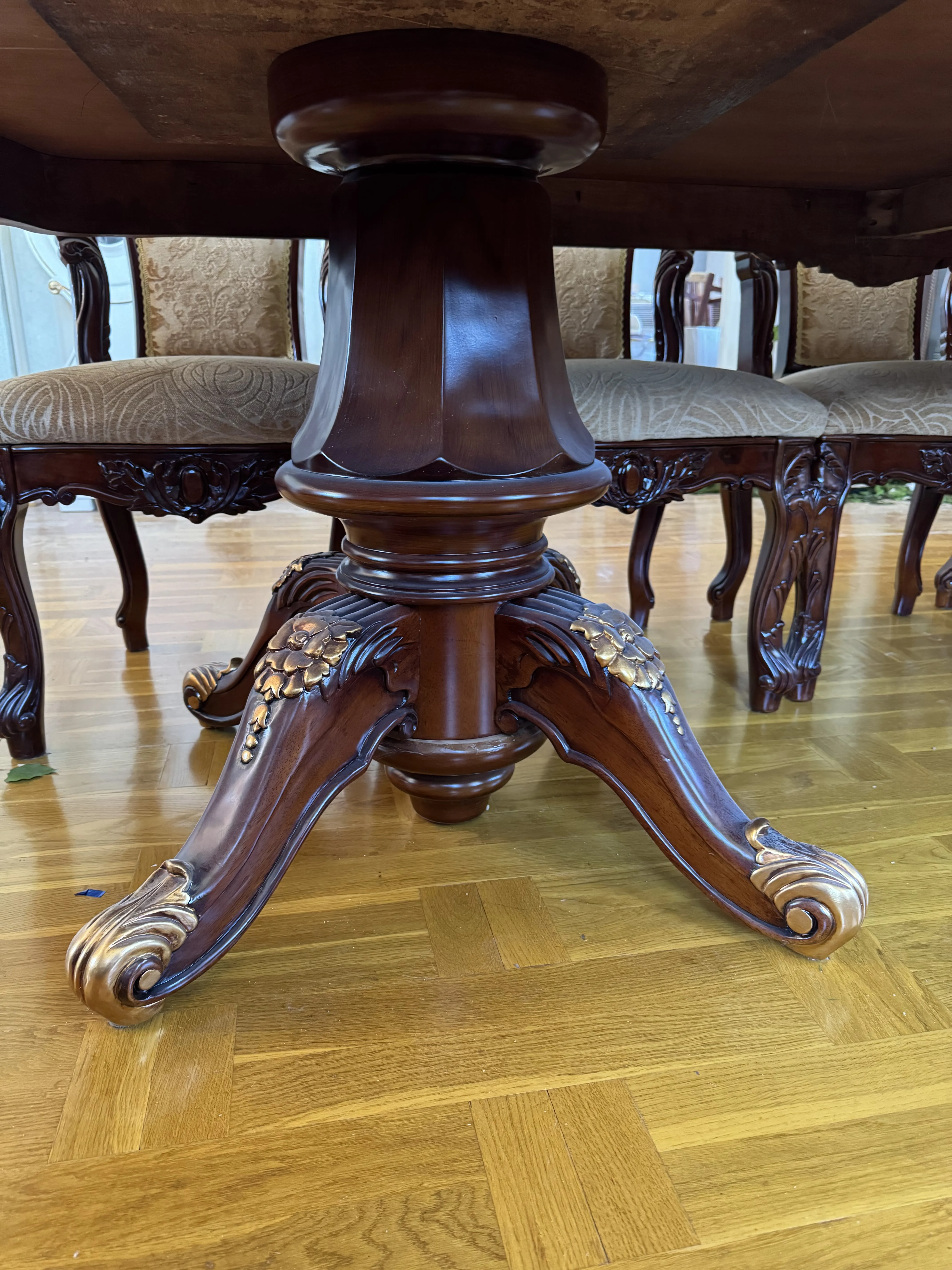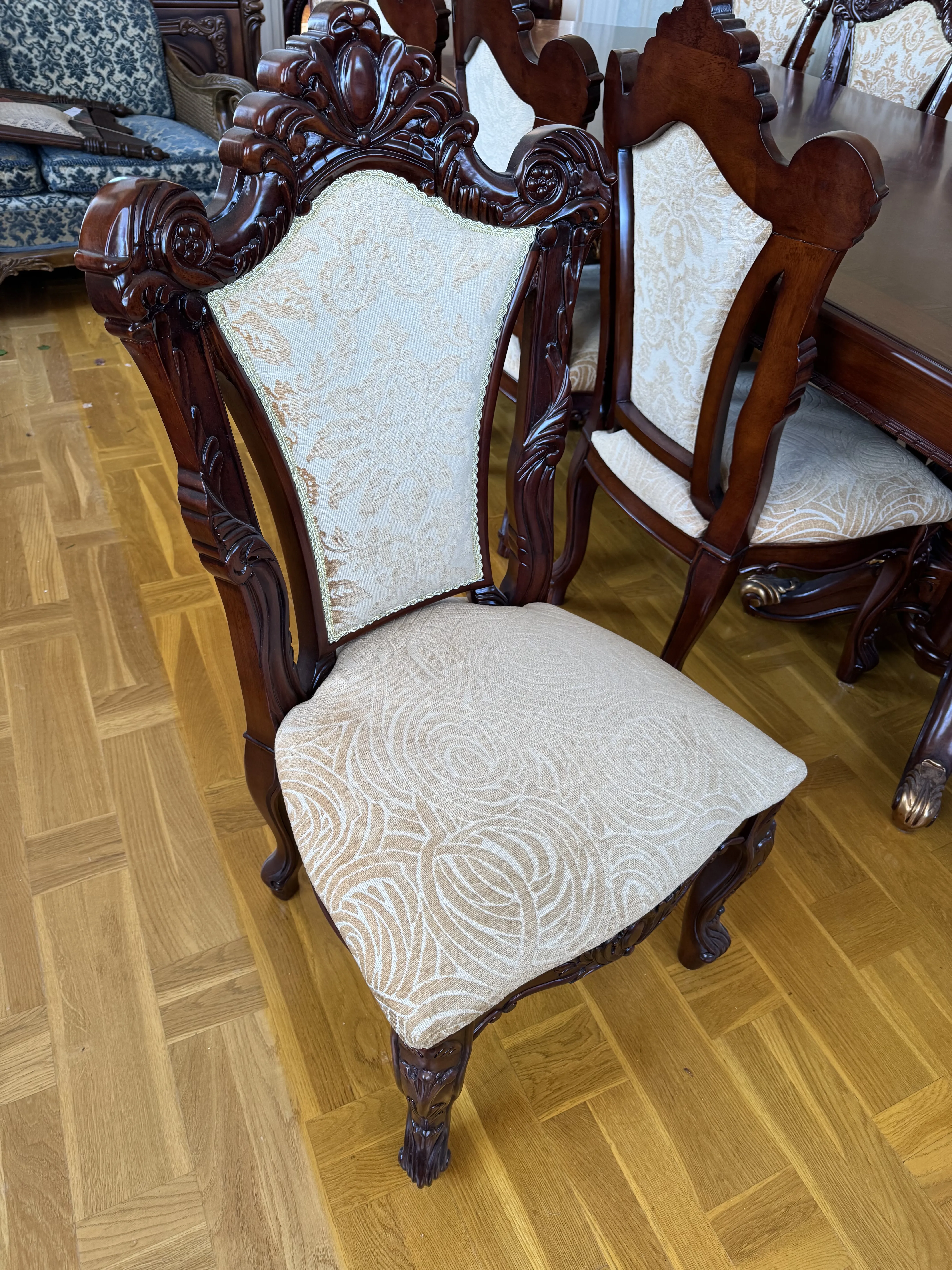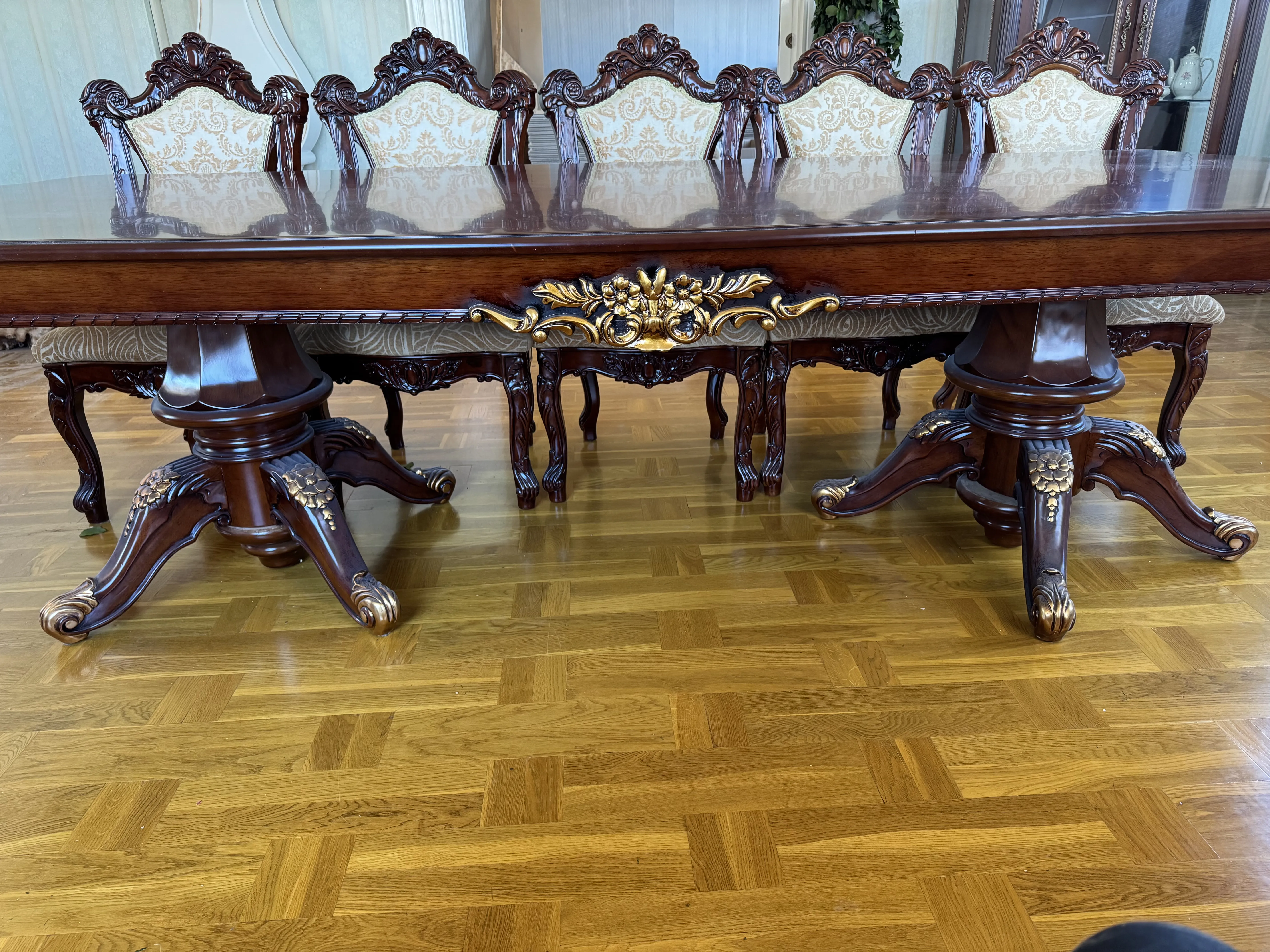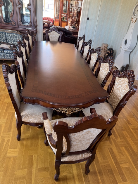495. Stort matsalsbord + 10stolar, 2 karmstolar. L.300cm B.120cm H.80cm