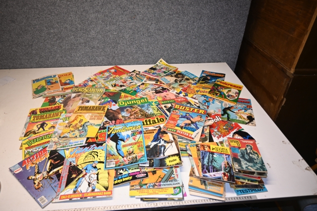Stort parti serietidningar bl a Stålmannen, Fantomen, Buster, Tomahawk m.fl