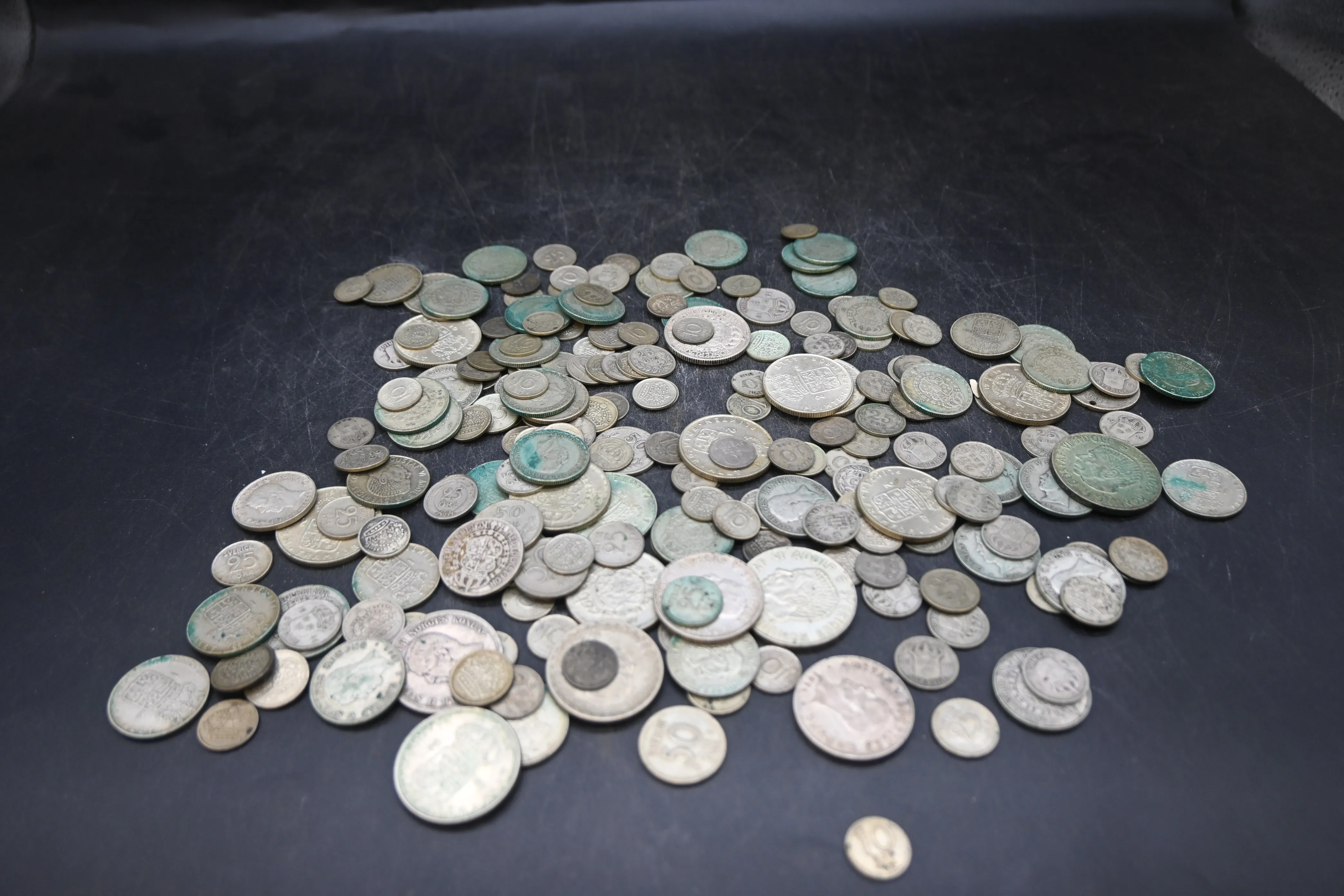 399. Svenska silvermynt 1-kroners 46st-13st före 1942, 2-kroners 16st-4st före 1940, 5kr 2st 1954/55, 50-öre, 25öre 10öre vikt 886.7gr