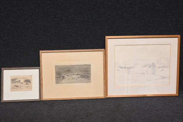 Tavlor 2 tryck + 1 blyerts av Paul Piltz motiv Gamla Gården Lysvik 1960.