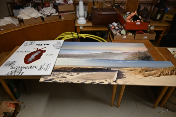 336. Parti handgjort hus H:28cm L.41cm, trämask, ljusstake, väggklocka, häst akupunktursmodell