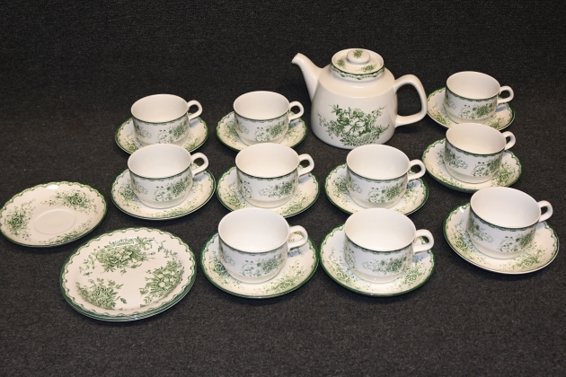 122. Teservis delar, Rörstrand "Grön Anna" 13del + extra tefat