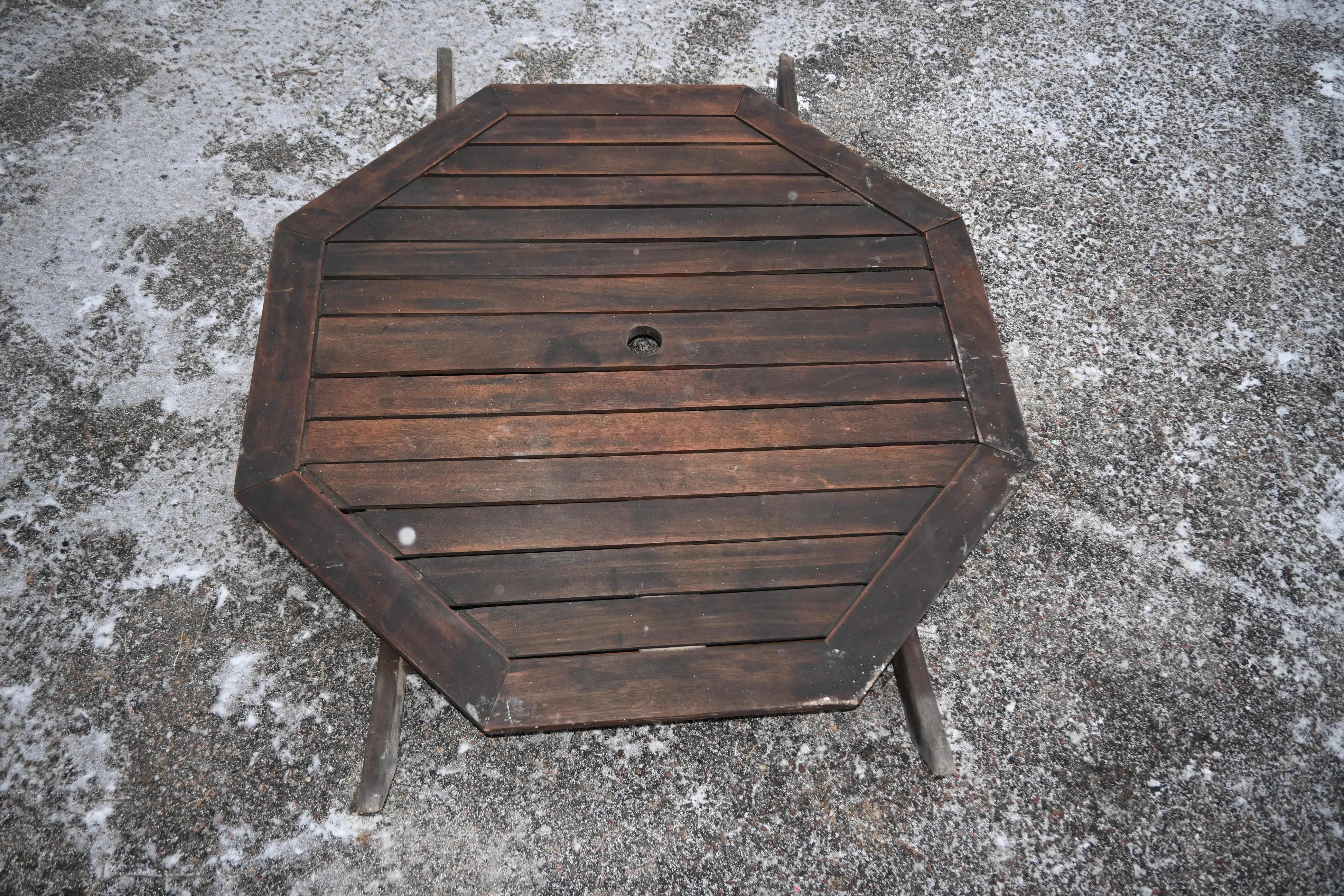 445. Trädgårdsmöbel i plast, bord + 8st stolar (Slitage)