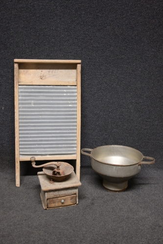 577. Tvättbräda, äldre kaffekvarn, mjölksil i zink