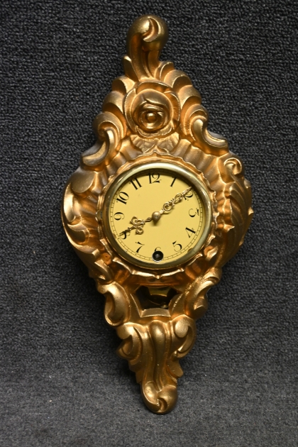 78. Väggklocka i förgylld metallgods H.33cm (glas saknas, defekt gång)