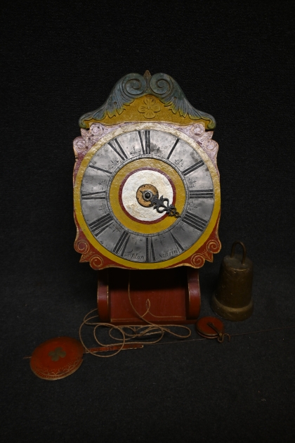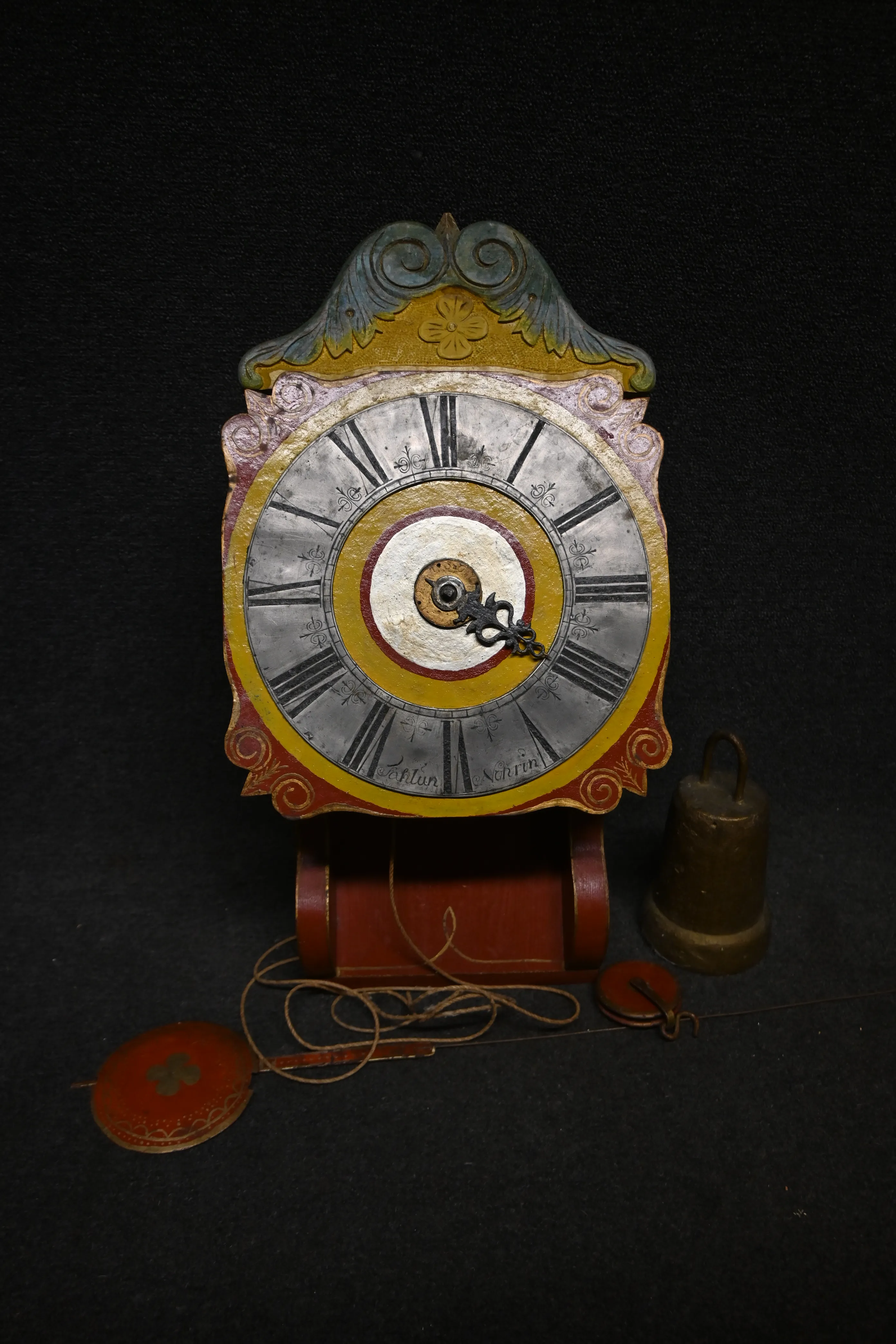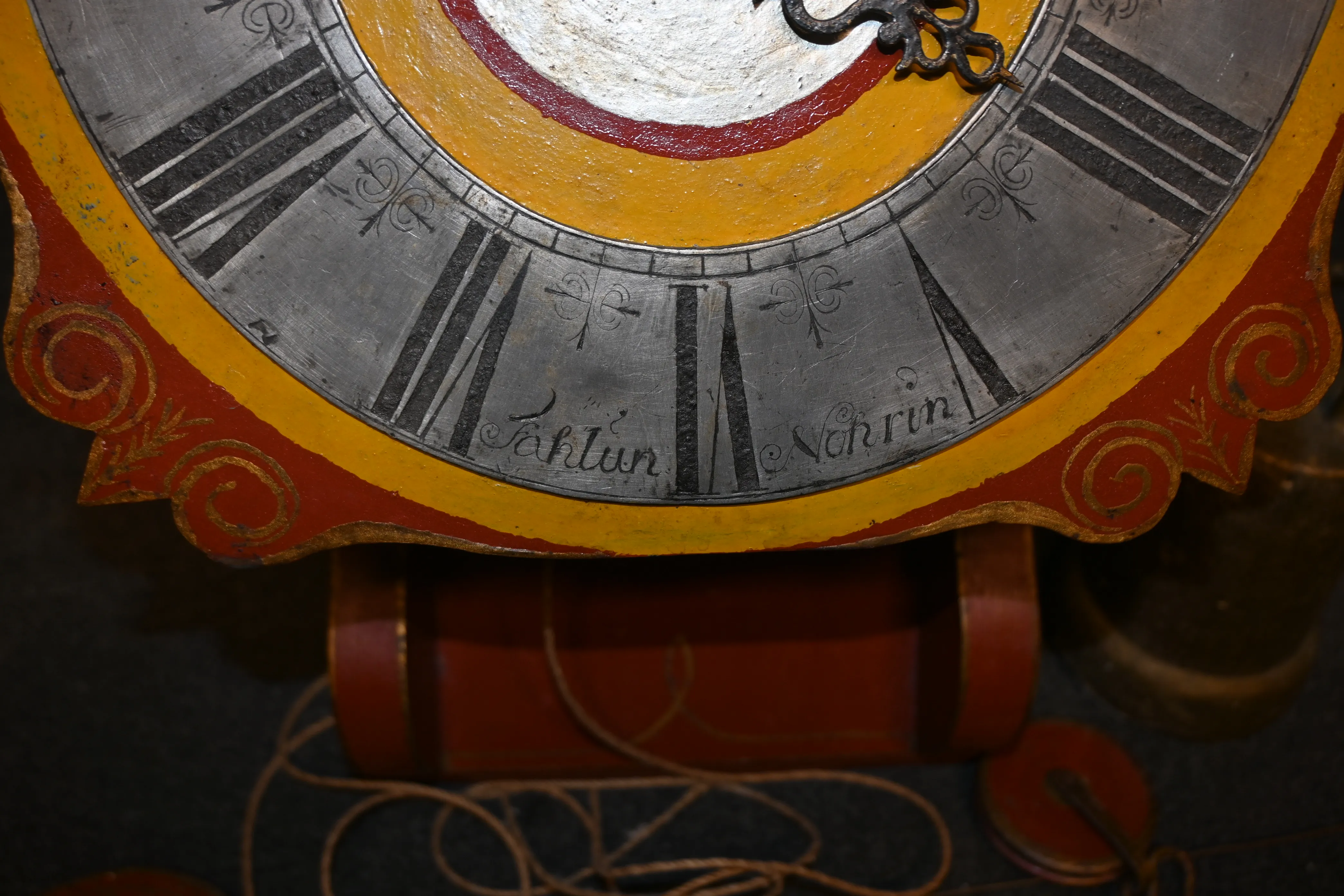 Väggklocka med urverk 1700.tal Fahlun Olof Nohrin med fodrall dat 1912 H.52cm. (fungerar, snöre till lod defekt)
