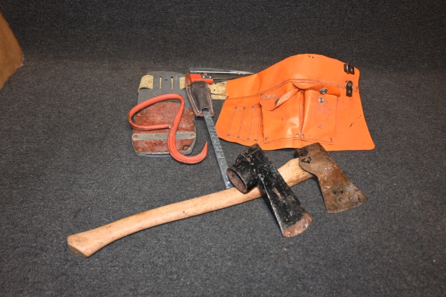 Verktygsbälte, timmeklave, vändhake, yxa. yxhuvud