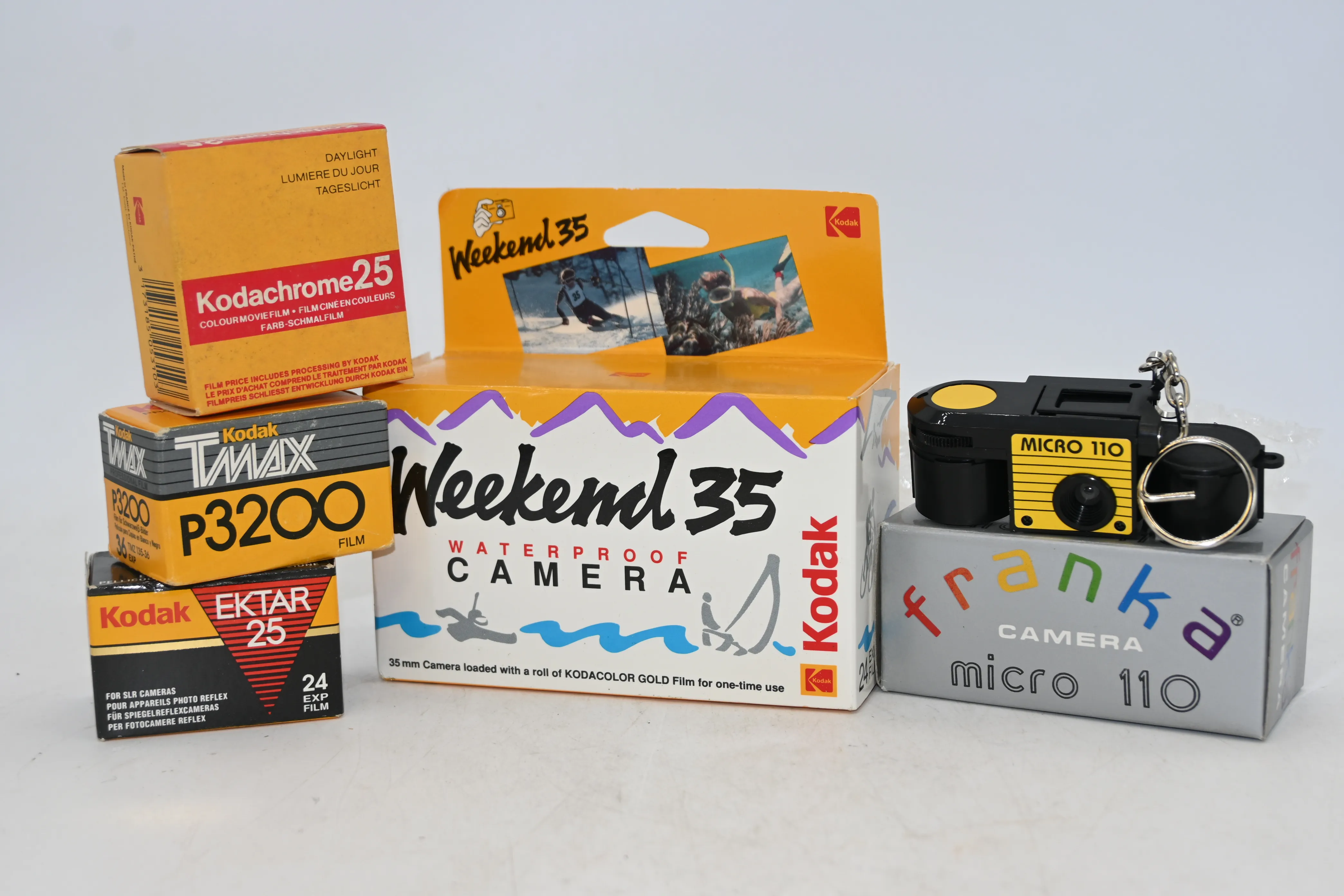 Waterprof kamera kodak "Weekend 35" + Franka kamera micro 110 + kodak filmer. (oanvänt)