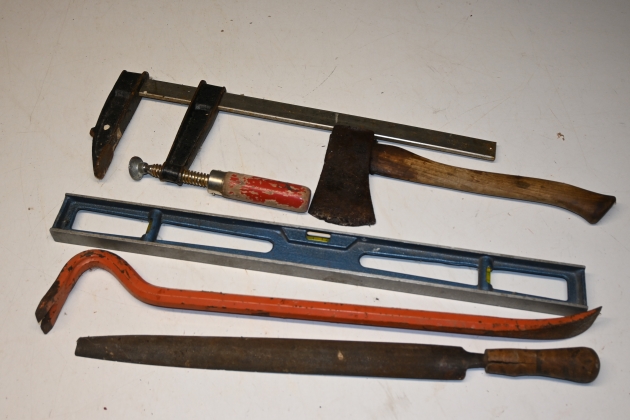 708. Trälåda + verktyg bl a navrar, borr m.m